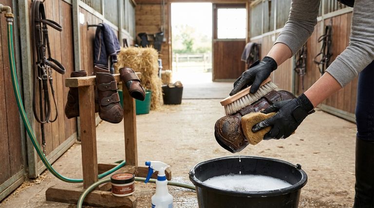Un enfoque sistemático de la limpieza previene la acumulación de suciedad abrasiva y bacterias dañinas que pueden degradar los materiales de las botas e irritar la piel de su caballo.