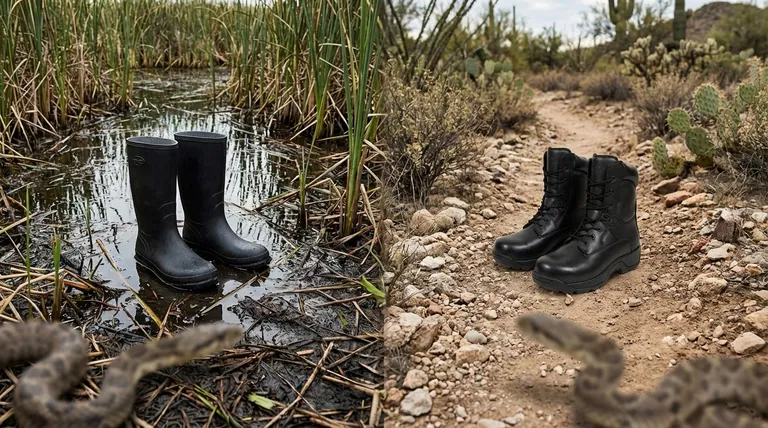 Tu elección entre goma y cuero no se trata de cuál es mejor para detener un colmillo de serpiente, sino de qué material proporciona el equilibrio adecuado de impermeabilidad, transpirabilidad y comodidad para el entorno específico en el que te encontrarás.