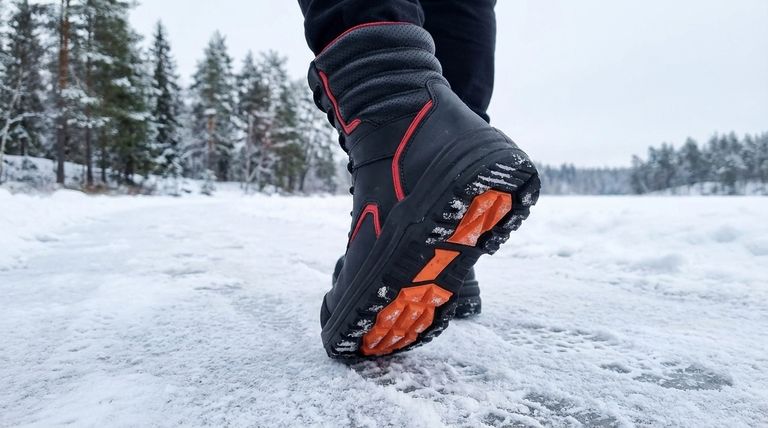 La defensa principal de una bota contra el deslizamiento es su material de suela. Muchas botas para todo tipo de clima utilizan compuestos de goma más duros que se vuelven rígidos y resbaladizos con el frío, muy parecido a un neumático de coche de verano en una carretera helada.