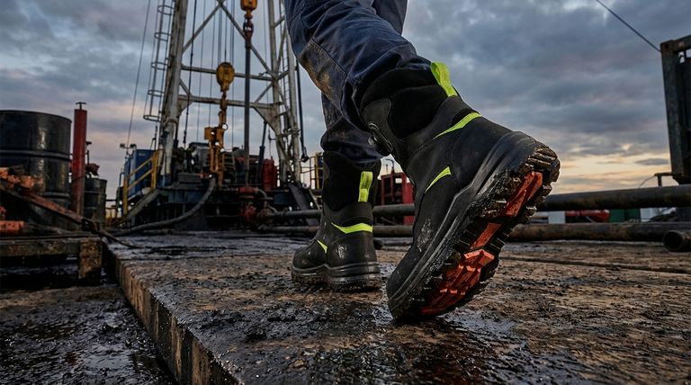 El aceite, el barro y el agua crean peligros constantes de resbalones y caídas. Una bota eficaz para yacimientos petrolíferos debe tener una suela diseñada para una tracción superior en estas superficies.