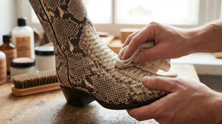Al pulir botas de piel de serpiente, la regla más importante es evitar por completo los pulimentos de color y trabajar siempre a favor de la veta de las escamas, nunca en contra. A diferencia del cuero estándar, la piel de serpiente es un material delicado compuesto por escamas individuales, y los métodos de cuidado tradicionales pueden causar daños irreversibles, decoloración y acumulación.