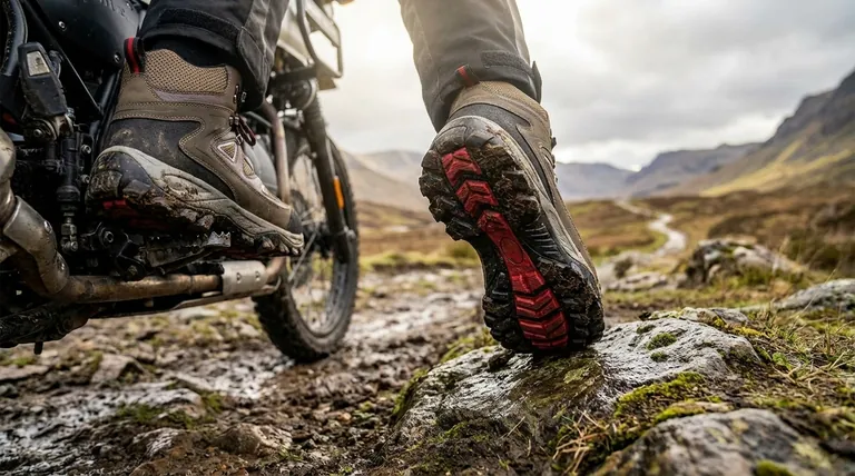 Una bota de aventura no es solo para conducir; es para todo el viaje. La suela es la interfaz crítica entre tú, tu máquina y el entorno.
